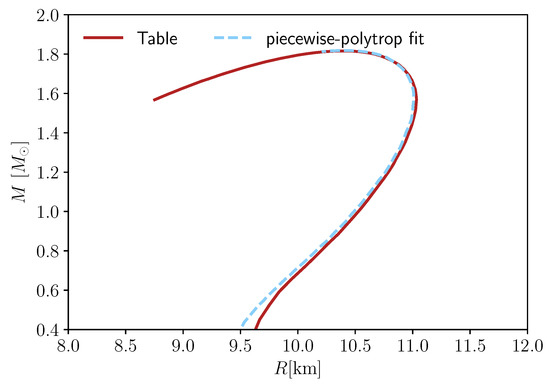 The SLy part of our hybrid EoS uses the piecewise polytrope representation given in Reference [55]. For the SQM phase, Equation (7) has to be interpolated as polytropes in rest mass density. This is done producing a tabulated version of the SQM EoS and dividing this part of the EoS into fifteen pieces from which we built the SQM piecewise polytrope. The complete HyS piecewise polytrope can be found in Appendix A. In Figure 3 we compare the results of the mass-radius curve for an isolated TOV star obtained using the tabulated EoS and the piecewise polytrope EoS. For the gravitational mass used in this article, we find a difference less than in the star radius.