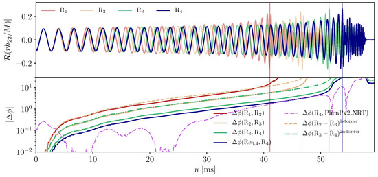 Finally, assuming second order convergence, we perform a Richardson extrapolation to obtain a better prediction for the GW phase, denoted by . We compare with the GW approximant IMRPhenomPv2_NRTidal [21,71,72], which has been employed by the Ligo and Virgo Collaborations for the analysis of GW170817 in References [6,7,8,73]. This approximant (IMRPhenomPv2_NRTidal) is a phenomenological waveform model which has been developed for the description of BNS systems. During its construction only NR simulations with hadronic EOSs were used [21]. Therefore, we use this model to compare our results of hybrid star binaries with predictions for purely hadronic EOSs. The exact waveform IMRPhenomPv2_NRTidal, which we compare to, uses the same masses and tidal deformabilities as our NR simulation. Finally, the IMRPhenomPv2_NRTidal and our hybrid star waveform are aligned within a time window by minimizing the phase difference within this interval to allow a reasonable comparison and to compute the phase difference. The phase difference between resolution and IMRPhenomPv2_NRTidal is shown as a dash-dotted purple line in Figure 5 (bottom panel). We find that until the moment of merger, the phase difference is below the estimated error (Note that the larger dephasing at the beginning of the simulation can be explained by junk radiation.), which is the first validation of a waveform model against a NR dataset including a strong phase transition inside the star. That the difference between the NR data and the waveform approximant is below the uncertainty of the data strengthens the reliability of models used for GW data analysis even if these have been derived for purely hadronic EOSs. However, due to the reduced convergence order and the large phase error of our simulations, further evolutions with higher resolutions are required for a more quantitative and stronger test.