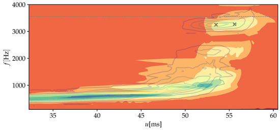 Spectrogram for resolution R4 (filled contours) and resolution R3 (solid lines). We mark the dominant postmerger frequency for the two resolutions as black crosses. In addition we include as a horizontal dashed line the postmerger frequency estimate derived from Reference [83].
