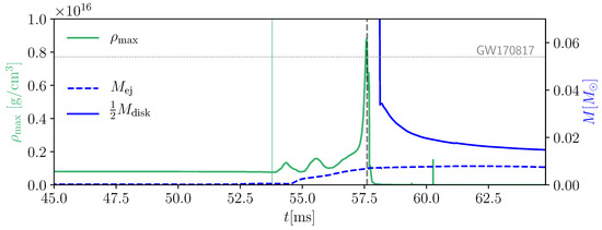 Time evolution of the maximum density (green) and the amount of ejected material (dashed blue) and the disk mass (solid blue) for resolution R3. The ejected material is estimated according to Equations (14) and (15) of Reference [52], that is, all material is marked as ejecta as long as it is gravitationally unbound and has an outward pointing velocity.