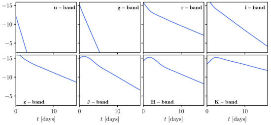 To estimate the absolute magnitude of the kilonova connected to the HyS merger, we use the kilonova model of References [11,98]. The model of Reference [98] employs a multi-dimensional Monte Carlo code to solve the multi-wavelength radiation transport equation for a relativistically expanding medium. To obtain the final predicted lightcurves, we interpolate between the existing Monte Carlo simulations using the Gaussian Process Regression techniques discussed in Reference [11]. For our estimates, we use the dynamical ejecta component which leaves the system with an average velocity of . Furthermore, we assume a lanthanide fraction . For the disk wind ejecta, we assume a velocity of , a lanthanide fraction of , and an ejecta mass of . The largest absolute magnitudes are obtained in the near-infrared, for example, i- and K-band, while in the optical and ultraviolet the signal is fainter, see Figure 8.