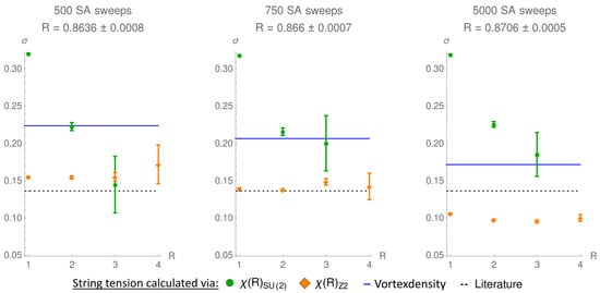 The string tension, calculated via Creutz ratios of the full theory , the center-projected theory , and the vortex density. By increasing the number of simulated annealing sweeps, a better value of gauge functional is reached, but the string tension is underestimated by . The data was calculated in lattices of size (left), (middle), and (right) in Wilson action. The vortex density was not corrected for correlated P-plaquettes, hence, it is overestimated.