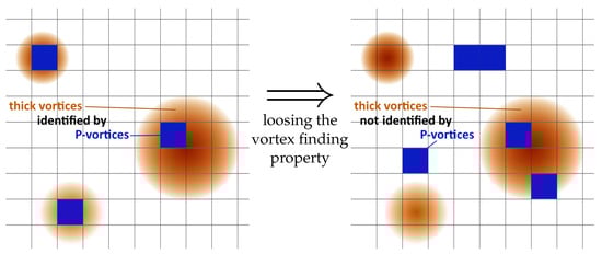 When P-vortices no longer locate thick vortices, we speak of a loss of the vortex finding property. The figure shows a two-dimensional slice through a four-dimensional lattice.