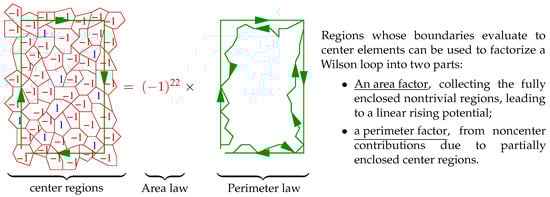 By finding center regions, that is, plaquettes within S that combine to bigger regions which evaluate to center elements, the Wilson loop spanning S can be factorized into a commuting factor, a center element, and an non-Abelian part, see Figure 6.