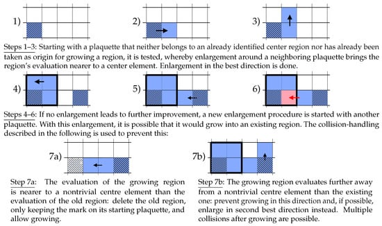 The algorithm for detecting center regions repeats these procedures until every plaquette either belongs to an identified region or has been taken once as starting plaquette for growing a region. The arrow marks the direction of enlargement. Plaquettes belonging to a region are colored, plaquettes already used as origin are shaded.