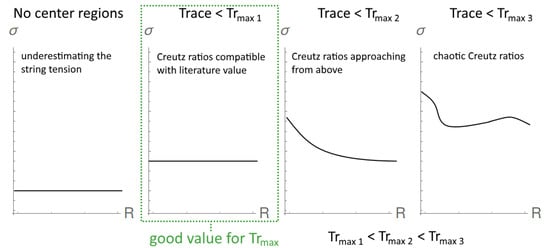 The regions identified this way comprise of many, whose evaluation deviates far from the center of the group. A set of nontrivial center regions has to be selected from the set of identified regions, only regions with traces smaller than are taken into account. This parameter has to be adjusted under consideration of the behavior of Creutz ratios, as shown in Figure 8, which are calculated after gauge-fixing and center projection.