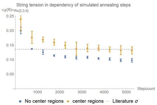 The Creutz ratios tend towards the literature value of the string tension with increasing number of simulated annealing steps with a , whereas they clearly underestimate the string tension when center regions are ignored, see Figure 9.