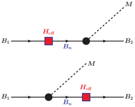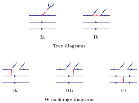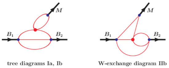 - The decays with a -baryon containing a symmetric diquark described by the interpolating current . The W–exchange contribution is strongly suppressed due to the Körner-Pati-Woo (KPW) theorem [33,34], which states that the contraction of the flavor antisymmetric current-current operator with a flavor symmetric final state configuration is zero in the limit.
