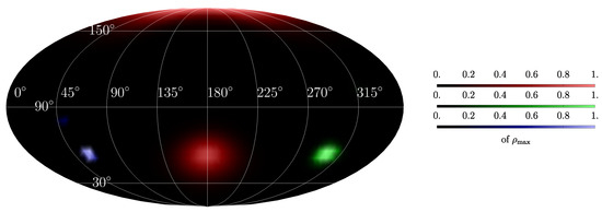 Mollweide projection of the differential signal photon number . The longitude gives the coordinate and the latitude . The three different colors denote the considered frequency regimes, i.e., to (red), to (green) and to (blue). The color scale is linear and normalized to the maximum values of each frequency regime. Next to the main peaks coinciding with the propagation directions of the driving beams, there are additional, less pronounced peaks in other directions.