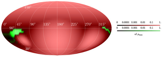Mollweide projection of the differential number of signal photons and driving laser photons in the all-optical regime. The longitude gives the coordinate and the latitude . In the red shaded areas the driving laser photons dominate, while in the green shaded areas the signal photons dominate. The color scale is logarithmic and normalized to the maximum values of each type of signal.