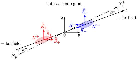 In the next step, we study optical signatures of quantum vacuum nonlinearity in the head-on collision of two laser pulses, which we label by . For simplicity, we only focus on optimal collisions at zero impact parameter. Without loss of generality, the + (−) pulse is assumed to propagate in positive (negative) z direction, i.e., . Here, is the unit vector pointing in z direction. In turn, the associated electric and magnetic field vectors can be parameterized as and , with