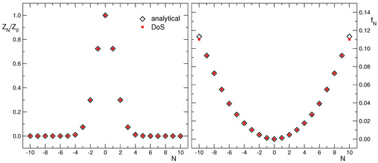 The canonical partition sums (lhs) and the corresponding free energy densities (rhs) as a function of the net fermion number N. The parameters are with , and we compare the results from the CanDoS determination (red dots) to the analytic results obtained with Fourier transformation (black diamonds).