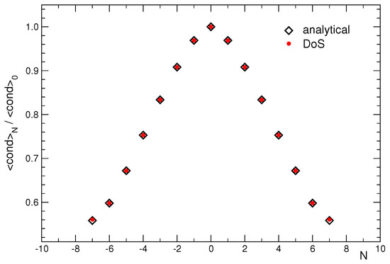 The chiral condensate (in the plot denoted as and normalized by the value) as a function of the net fermion number N. The parameters are with , and we compare the results from the CanDoS determination (red dots) to the analytic results obtained with Fourier transformation (black diamonds).