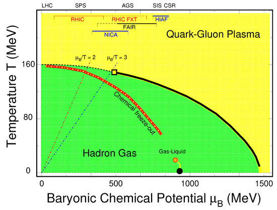 Tremendous efforts from both experimental and theoretical sides have launched in order to address the question. Figure 1 summarizes the current status of the studies. At the zero baryonic density, the transition from QGP to hadronic matter is a smooth-crossover at T = MeV [5,6,7,8,9], see dashed-line in the figure. These results are extracted from the state of the art Lattice gauge theory calculations. At high baryonic density, on the other hand, one would expect a first-order phase transition, shown as a black solid-line. Thermodynamically the first-order phase boundary line must end at finite baryonic density, this is the illusive QCD critical point (CP). Again, recent Lattice calculations have concluded that the QCD critical is ‘unfavored’ [10,11] when . The red-line is the chemical freeze-out curve extracted from the measured hadron yields. The collision energies with the corresponding accelerator complex are indicated at the top of the figure.