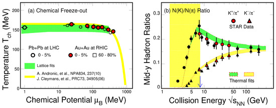 Experimental status on the beam energy scan (BES) is highlighted in Figure 2. Plot (a) shows the chemical freeze-out temperature as a function of the baryonic chemical potential . Both ALICE at LHC and STAR at RHIC results clearly show that at the vanishing baryon density, i.e., at high collision energy, the data driven freeze-out temperature is consistent with the Lattice calculation, MeV. Many authors have tried to analyze the chemical freeze-out conditions. Those include the results fluctuations analysis from Lattice QCD [18,19,20,21,22], HRG model [12] and other methods [23,24]. In the low baryon density region, MeV, the dependence of the freeze-out temperature is quite weak and the value of the freeze-out temperature is around 150–160 MeV. More dramatic drop of the temperature is seen in the high baryon density region. Plot (b) is the kaon over pion yield ratios, extracted from central heavy-ion collisions, as a function of the collision energies. While one observes the smooth increase of the negative kaon over pion ratio with the collision energy, the positive ratio shows a broad peak around GeV and eventually merged with the negative ratios at high collision energy, GeV, where the pair production becomes dominant. Due to the associate channel, , positive kaons carry information on baryon density. The peak in plot (b) implies the maximum freeze-out density reached at 8 GeV. Later in the discussions, we attribute the region of GeV as the high baryon density region (HBDR) as indicated by the yellow-area in the plot.