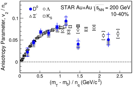 The main goal of high energy heavy-ion collisions, such as collisions at LHC and top energy collisions at RHIC, is to study the properties of new form of matter QGP. QGP is a thermalized (or nearly) system with partonic degree of freedom. The elliptic flow measurement of multi-strange hadrons and mesons indicates the partonic collectivity has been built up at the top energy heavy-ion collisions at RHIC [31,32,33,34,35,36,37]. The Heavy Flavor Tracker, a high resolution silicon detector system, which was installed in the year of 2013, provides high vertex position resolution. The significance of charmed hadron reconstruction is significantly improved. Thus the precise measurement of becomes possible. Figure 3 shows the results for , , and [38]. A number of constituent quark () is tested by scaling both and with . A simple quark coalescence or recombination model suggests the baryon would be 1.5 times of the meson assuming the collectivity has been attained in the partonic stage, as the number of constituent quarks for baryons is 3 where it is 2 for mesons. When discussing the scaling, we usually focus on the intermediate range in which the value saturates. The follows the scalings with selected multi-strange and strange hadrons in Figure 3. It indicates the collectivity of parton level has been built up from light flavor u, d quarks to strange and charm quarks. Since the mass of the charm-quark is much larger than the temperature reached in the system, the observed strong charm-quark collectivity can be interpreted as the thermalization of the medium created in the 200 GeV Au+Au collisions at RHIC [38]. To some extent, this result justified the phase diagram sketched in Figure 1.