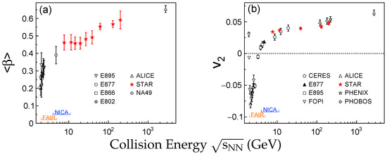 The parameter extracted from blast wave model reflects the transverse radial flow built-up in the collision system. The second order coefficient of final azimuth distribution in the momentum space, , is sensitive to the initial geometry and interactions of early stage of the collisions. It suggests that a non-monotonic variation could be observed around the so-called, “softest point of EOS” [68,69]. The “softest point of EOS” is usually defined as a strong drop of speed of sound (a minimum value) or a reduction in the pressure of the system during the dynamic evolution. Plot (b) of Figure 4 shows the -integrated from 20%–30% or similar centrality as a function of collision energy. The data points are from E895 [55] for protons, NA49 [56] for pions and FOPI [57], E877 [58], CERES [59], STAR and ALICE [60] for charged hadrons. The RHIC results of inclusive charged particles for 130 and 200 GeV are from refs. [61,62,63,64,65]. The RHIC BES data are from refs. [66,67]. The negative (3 GeV) is known due to the “squeeze-out” effect [57]. An increasing trend is observed for integrated from AGS to LHC. It appears that the slope of with collision energy is steeper for 3–7.7 GeV compared to 7.7–2760 GeV, which is consistent with that we observe for parameter. The of charged hadrons as a function of does not change significantly at RHIC BES and LHC energies. Due to the rise in mean which is expected from larger radial flow, the -integrated increases. It is consistent with the collision energy dependence of parameter, as discussed in panel (a) of Figure 4. Non-monotonic behavior which is predicted by the softening of the equation of state for a system close to the critical temperature [68] is not observed.