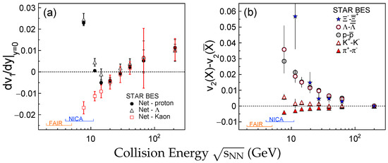 The first order coefficient of final azimuth distribution in the momentum space, (rapidity-odd), as a function of rapidity is sensitive to the system expansion during the early stage of collisions. Both hydrodynamic and nuclear transport models indicate that in the midrapidity region offers sensitivity to details of the expansion of the participant matter during the early collision stages [70,71,72]. Hydrodynamic plus first-order phase transition calculations suggest a minimum of net-baryon slope () near mid-rapidity is a signal of phase transition between QGP and hadronic matter [73,74]. Net-particle is defined as the excess yield of a particle type over its anti-particle [75,76]. The of net-particle is defined as: , where X represents particle, represents the corresponding anti-particle, is the ratio of particle to anti-particle yield. Plot (a) of Figure 5 shows the slope relative to rapidity for net-proton, net- and net-kaon. Similar energy dependence is observed for net-proton and net-. The non-monotonic behavior is consistent with the hydrodynamical calculations with first-order phase transition [73,74]. Large divergence between of net-kaon and net-proton (net-) is observed below GeV, whereas all three agrees well at and above 20 GeV. More theoretical inputs are needed to understand the difference. At the same time the measurements of centrality dependence in the future BES program will further verify the energy dependence and constrain model calculations. In Ref. [76], the of mesons shows larger magnitude than pions and kaons at and above 14.5 GeV, and more interesting, the meson slope seems to increase sharply at 11.5 GeV. Because of the large statistical uncertainties, it is still not conclusive. It opens a new direction for both experimental and theoretical investigation on directed flow [77].