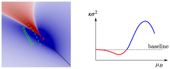 Figure 6 (left) shows the density plot of fourth order cumulant of order parameter as a function of temperature and baryon chemical potential (T and ) by mapping the Ising equation of state onto the QCD equation of state near the critical point [97]. The red and blue regions in the density plot denote the negative and positive contributions to the fourth order cumulant, respectively. Experimentally, by tuning the beam energy, the T and at chemical freeze-out are varied accordingly. The green dashed line represents the chemical freeze-out points (T, ) passing through the critical region when one varies the beam energies. Figure 6 (right) shows fourth order fluctuation as a function of baryon chemical potential (). Due to the negative and positive critical contributions near the critical point, the will show a non-monotonic energy or dependence with respect to the non-critical baseline. This is the characteristic experimental signature of the critical point we are looking for in the heavy-ion collision experiment. Theoretically, the properties of QCD phase diagram at finite baryon density and the signatures of conserved charge fluctuations near the QCD critical point have been extensively studied by various model calculations, such as Lattice QCD [10,18,19,20,21,22,98], NJL, PNJL model [99,100,101,102,103,104,105,106], PQM, FRG model [107,108,109], Dyson-Schwinger Equation (DSE) method [110,111,112,113], chiral hydrodynamics [114] and other effective models [94,115,116,117,118,119]. However, one should keep in mind that the above results are under the assumption of thermal equilibrium with infinite and static medium. In the real heavy-ion collisions, there exists the effects of finite size/time [120,121,122], non-equilibrium [123,124,125,126,127] and thermal blurring effects [128]. Dynamical modeling of heavy-ion collisions by implementing both the critical and those background effects are ongoing [129,130,131].
