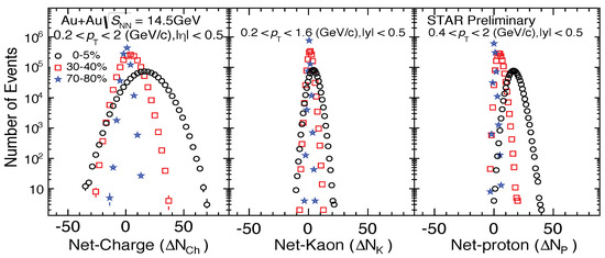 (Color online) The STAR measured raw event-by-event net-charge, net-kaon and net-proton distributions of three centralities (0–5%, 30%–40% and 70%–80%) in Au+Au collisions at = 14.5 GeV [151].