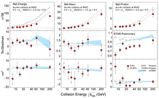 - Xu, J.; Yu, S.; Liu, F.; Luo, X. Cumulants of net-proton, net-kaon, and net-charge multiplicity distributions in Au + Au collisions at = 7.7, 11.5, 19.6, 27, 39, 62.4, and 200 GeV within the UrQMD model. Phys. Rev. C 2016, 94, 024901. [Google Scholar] [CrossRef]