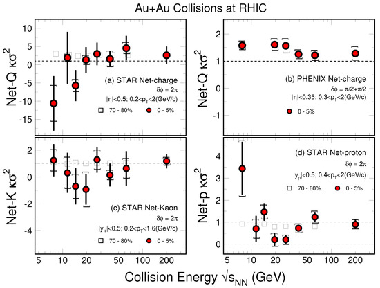 In Figure 9, we summarize the energy dependence of of net-charge, net-kaon and net-proton multiplicity distributions in Au+Au collisions measured by the STAR experiment. For comparison, the net-charge results in Au+Au collisions at = 7.7, 19.6, 27, 39, 62.4 and 200 GeV measured by the PHENIX experiment [159] are shown in the panel (b). We found that the of the net-charge and net-kaon multiplicity distributions measured by the STAR experiment show larger statistical uncertainties than those of net-proton . This can be understood as the statistical uncertainties of depend on the width () of the multiplicity distributions and the particle detecting efficiencies () in the detector as [146]. The width of the net-charge distributions are larger than those of net-proton and net-kaon. Meanwhile, due to decays, the efficiency of kaon (∼40%) is much lower than proton (∼80%). It is the reason why we observe larger statistical uncertainties for net-kaon fluctuations than net-proton. For the net-charge and net-kaon from STAR, we observe weak energy dependence within current statistical uncertainties. The PHENIX net-charge are with much smaller statistical uncertainties than the results from STAR. This is due to smaller acceptance of PHENIX detector than the STAR detector, thus the width of the net-charge multiplicity distributions measured by the PHENIX experiment is much narrower than those measured by STAR. We observe a clear non-monotonic energy dependence for net-proton in the most central (0–5%) Au+Au collisions with a minimum around 19.6 GeV. This non-monotonic behavior cannot be described by various model calculations without the physics of phase transition and critical point.