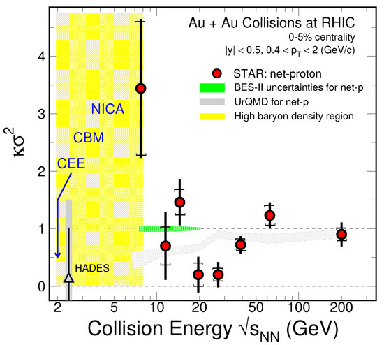In Figure 10, the results from the transport model UrQMD (grey band) show a monotonic decrease from low to high baryon density region, which is due to the effect of baryon number conservation in high-energy nuclear collisions. Note that in the Poisson limit, the absence of criticality or other dynamical correlations, the is expected to be unity. The green band in the figure is the projected statistical error of the fourth-order fluctuations of net-protons in the second phase of the RHIC Beam Energy Scan (BES-II, 2019–2021) program [161]. The BES-II program, which is scheduled between 2019 and 2021 for the Au+Au collisions at 7.7–19.6 GeV, will take about 10 to 20 times higher statistics (depending on energy) to confirm the non-monotonic behavior observed in the fourth order fluctuations () of net-proton and proton in Au+Au collisions in the BES-I at RHIC. Assuming the data in the figure is related to the critical region, one must study the net-proton fluctuations at even higher baryon density region, i.e., at lower collision energies. The yellow band shown in the figure represents the high baryon density region ( = 2–8 GeV) covered by future FAIR/CBM fixed target (FXT) experiment ( = 2–5 GeV) [162] and the NICA/MPD collider experiment ( = 4–11 GeV) [163]..