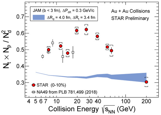 - Zhang, D. Energy Dependence of Light Nuclei (d, t) Production at STAR. arXiv 2019, arXiv:1909.07028. [Google Scholar]