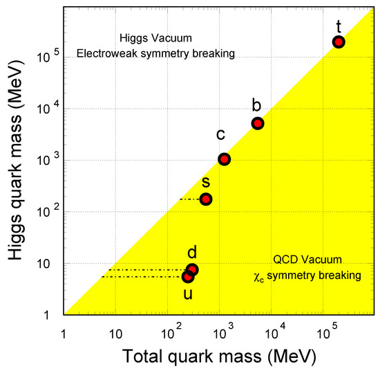 (Color online) Quark masses in the QCD vacuum and the Higgs vacuum. A large fraction of the light quark mass is due the the chiral symmetry breaking in the QCD vacuum. The numerical values were taken from reference [169]. The plot is taken from Ref. [170].