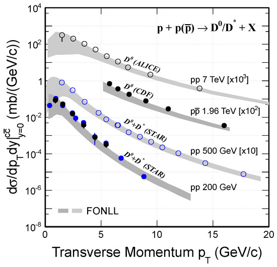 - Adamczyk, L.; Agakishiev, G.; Aggarwal, M.; Ahammed, Z.; Alakhverdyants, A.; Alekseev, I.; Alford, J.; Anderson, B.; Anson, C.; Arkhipkin, D.; et al. Measurements of D0 and D∗ production in p + p collisions at = 200 GeV. Phys. Rev. D 2011, 86, 072013. [Google Scholar] [CrossRef]