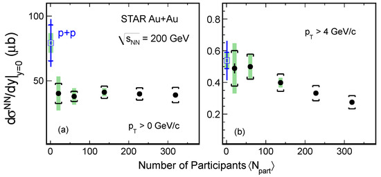 (Color online) Integrated cross section per nucleon-nucleon collision at mid-rapidity in 200 GeV Au+Au collisions for > 0 (a) and > 4 GeV/c (b) as a function of centrality . The statistical and systematic uncertainties are shown as bars and brackets on the data points. The green boxes on the data points depict the overall normalization uncertainties in p+p and Au+Au data respectively.