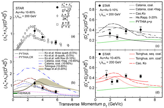 - Oh, Y.; Ko, C.; Lee, S.; Yasui, S. Heavy baryon/meson ratios in relativistic heavy-ion collisions. Phys. Rev. C 2009, 79, 044905. [Google Scholar] [CrossRef]