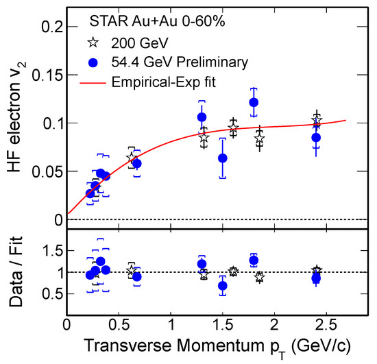 Figure 16 shows the of electrons from heavy flavor decays as a function of in 54 and 200 GeV Au+Au collisions [190] as solid circles and open stars, respectively. A semi-empirical exponential function [191] is used to fit all the data points and the ratios of data over the fit function are shown in the bottom panel. The result in 54 GeV agrees with that in 200 GeV within uncertainties, which may suggest charm quarks are still thermalized in 54 GeV Au+Au collisions. On the other hand, it is of interest to repeat the same measurement in lower energies, such as 27 GeV from STAR BESII experiment.
