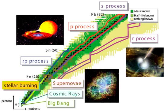 Sketch of the nuclear chart including the various paths of nucleosynthesis. The rapid proton capture (rp) process and the proton capture (p) process happen in binary systems consisting of a sun and a neutron star. The rapid neutron capture (r) process takes place in supernova explosions and neutron star mergers. The subfigures illustrate the corresponding astrophysical processes and sites.