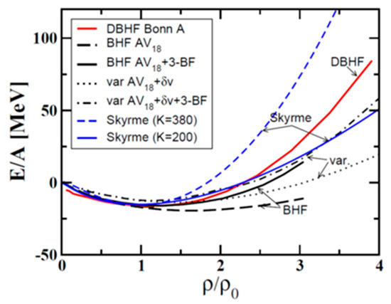 with the asymmetry parameter δ = (ρn − ρp)/ρ. Symmetric matter is stable around saturation density ρ0 with a binding energy of E/A(ρo) = −16 MeV, the slope δ(E/A)(ρo)/δρ = 0 and the curvature Knm = 9ρ2 δ2(E/A)/δρ2 with Knm the nuclear incompressibility. At saturation density, the incompressibility of symmetric matter has been determined from giant monopole resonances of heavy nuclei and found to be Knm (ρ0) = 230 ± 10 MeV [14]. Various EOS calculated for symmetric nuclear are shown in Figure 4 as function of density [15].