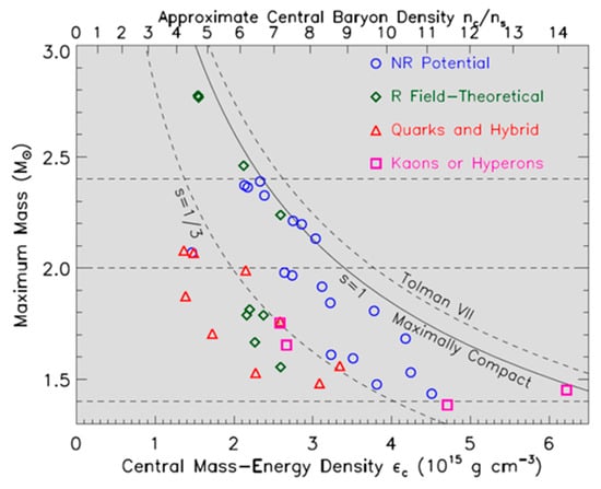 Maximum mass of neutron stars versus central density for different EOS [27].