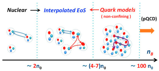 The conjectured QCD phase diagram shown in Figure 3 indicates a first order phase transition at high net-baryon densities, ending in a critical point. None of these structures has been found so far. As mentioned in the beginning, first-principle theories, such as perturbative QCD, still fail to make reliable predictions for properties of matter at large baryon chemical potentials. In order to get an idea on the degrees-of-freedoms of matter in the core of neutron stars, we have to rely on effective models. One example is illustrated in Figure 6, which depicts a schematic picture of a transition from nuclear to deconfined quark matter with increasing density [33]. For densities below 2 ρ0, the dominant interactions occur via a few meson or quark exchanges and the matter can be described in terms of interacting nucleons. For densities in the range from 2 ρ0 to 4–7 ρ0, many-quark exchanges dominate, and the system gradually changes from hadronic to quark matter. For densities beyond 4–7 ρ0, nucleons percolate, start to melt and to dissolve into their constituents, which do not longer belong to particular nucleons. A perturbative QCD description is expected to be valid only for extremely high densities, that is, above 100 ρ0.