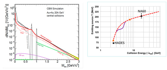 Left panel: Di-electron invariant mass spectrum simulated for central Au + Au collisions at 20 A GeV. Right panel: Sketch of the emitting source temperature as function of collision energy for two scenarios. The red dashed curve is the result of a calculation based on a thermal model assuming no phase transition or a crossover (see text) [39]. The purple line illustrates a hypothetical caloric curve reflecting a first order phase transition. In addition, the experiments result from HADES (High-Acceptance Di-Elektron Spectrometer) [37] and NA60 [40] are shown.