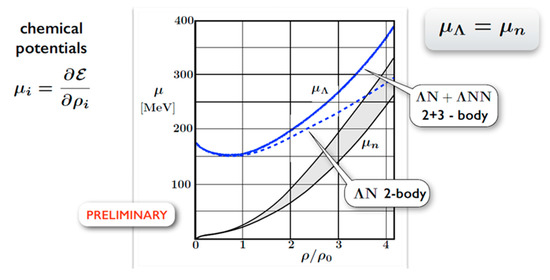 The high-density EOS might not only be softened by a phase transition from hadronic to quark degrees of freedom but also by hyperons, which should appear at high densities, if the chemical potential of neutrons and protons exceeds the chemical potential of hyperons. This process would prevent the formation of massive neutron stars, which, however, have been observed. In order to solve this “hyperon puzzle”, various models propose different mechanisms to circumvent a softening of the EOS at high densities. For example, calculations based on a 3-flavor Nambu Jona-Lasinio model describe quark deconfinement in neutron star cores and predict a mixed phase, where hadrons including hyperons and quarks coexist [34]. In this case, repulsive vector interactions among the quarks are proposed to provide a stiff EOS. The results of calculations based on chiral effective field theory assuming only hadronic degrees-of-freedom are illustrated in Figure 8, which depicts the chemical potentials of neutrons and lambdas as function of density [47]. The model features a repulsive ΛN potential together with repulsive 3-body ΛNN interactions at high densities, and, thus, prevents the condensation of lambdas below densities of about 5 ρ0.