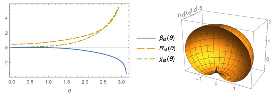 On the left: dependence of the stationary metric parameter , the Ricci scalar and the scalar field on the extra space azimuthal angle . On the right: image of the shape of two-dimensional extra space defined by the metric (13).