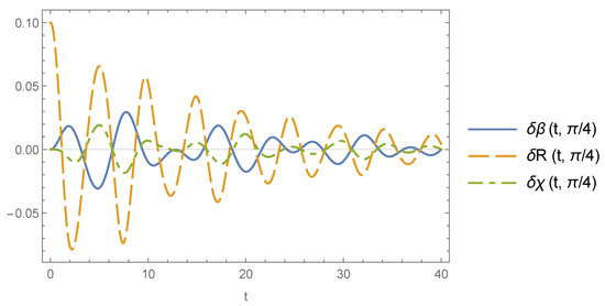 The result of calculations are presented in Figure 2. One can see the gradual damping of the oscillations of all sorts. The dumping similar to those shown in Figure 2 occurs for all angles . The Hubble friction term leads to the damping of perturbations and stabilization to a stationary configuration.