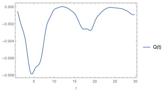We are interested, as was already mentioned, in how the number Q, which is conserved after inflation, could be initially accumulated. Therefore, we use perturbed solutions of system of Equation (17) for numerical calculation of the time dependence of . As a perturbation, we take traveling wave superposition with .