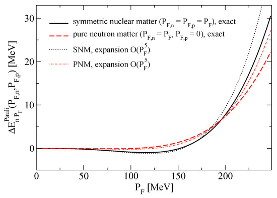 - Symmetric nuclear matter (SNM), for which andThe Pauli shift for protons is obtained using the symmetry relation that is encoded in the coefficients of Table 1. With these coefficients and the low-density expansion (A29) up to fifth order in the Fermi momentum, we obtainThis energy shift can be identified with a shift in the chemical potential and thus be used to derive a contribution to the equation of state, see [7].In order to give numerical results for the Pauli shift (4), we adopt the values MeV and fm according to [20], which reproduce quite well the single nucleon properties. With the relation , the Pauli blocking shift can be given as a function of the nuclear matter densitywith MeV fm3 and MeV fm5. As has been discussed already in [7], this density dependent energy shift is in good agreement with the repulsive part of the Skyrme Hartree–Fock shift in nuclear matter obtained by Vautherin and Brink [8].