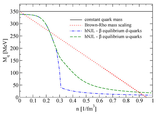 Dependence of the quark masses on density: constant quark mass (solid line), Brown–Rho scaling (dotted line), Nambu–Jona-Lasinio (hNJL) model in -equilibrium for u-quarks (dashed line) and for d-quarks (dash-dotted line).