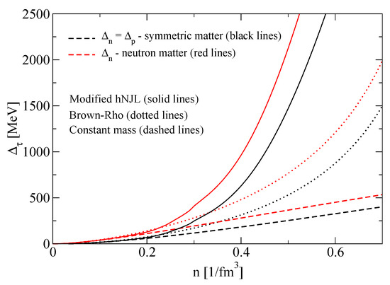 Effective chiral quark models for the low-energy sector of QCD are capable of addressing the aspect of dynamical chiral symmetry breaking and its restoration in a hot and dense medium, but have a problem with modeling confinement of quarks in hadrons. Here we suggest a compromise. We adopt a density dependence for the dynamically generated quark mass and thus achieve a chiral improvement of the quark Pauli blocking shift. We discuss in the following three schemes for this density-dependent quark mass: (i) a constant quark mass, (ii) a linear density dependence (called Brown–Rho scaling [21]) and (iii) a density dependence according to the calculation within a higher order Nambu–Jona-Lasinio model [22]. These density dependences of the quark mass are illustrated in Figure 2. In Figure 3 we show the energy shifts resulting from the insertion of the density dependencies for the Fermi momenta and the quark mass as shown in Figure 2 into Equations (4) and (7) for SNM and PNM, respectively.