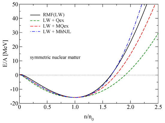Energy per nucleon of symmetric matter for relativistic mean-field (RMF) (LW) (solid lines), LW + Qex (dashed lines) and LW + MQex (long-dashed lines) models.
