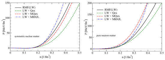 The EoS for the nuclear matter is obtained and in Figure 5 the pressure as a function of the density is shown for symmetric matter (left panel) and for pure neutron matter (right panel). The symmetry energy is shown and discussed below in Section 4.4 for all our models.
