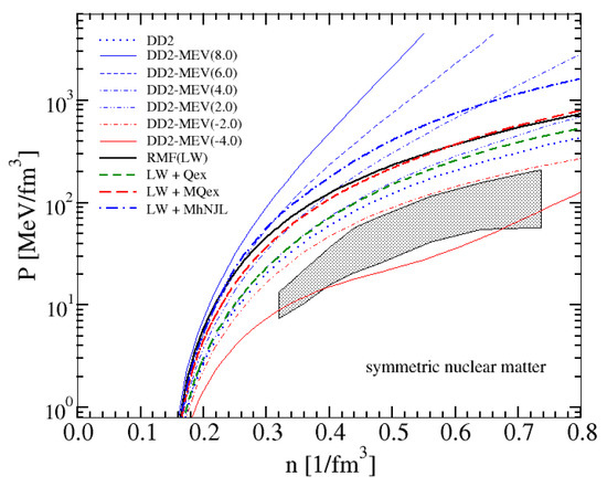 Also shown is the flow constraint derived from the analysis of heavy ion collision experiments [26]. From comparing the Pauli-blocking improved LW models with excluded-volume corrected DD2 models, we extracted a density-dependent excluded volume parameter and the corresponding hard-core radius for nucleons. We note that these results compare very well with nucleonic hard-core radii obtained within the induced surface tension approach reported in [9]. A thorough analysis of the critical temperature of symmetric nuclear matter, the incompressibility of the normal nuclear matter and the proton flow constraint clearly shows [9,27] that a hard-core radius of nucleons up to 0.45 fm is still consistent with the available experimental data. Therefore, the short dashed curve in Figure 7 is perfectly consistent with the known symmetric nuclear matter properties.