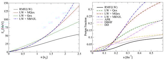 In the left panel of Figure 8, we show the symmetry energy as a function of the density for all considered models. In the right panel of Figure 8, we show the proton fraction as a function of the density which results from accounting for the -equilibrium with electrons for all considered models.
