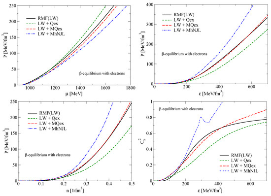 For all three models we construct the thermodynamics of stellar matter in -equilibrium fulfilling the charge neutrality condition with electrons and protons. In Figure 9 we show the EoS in -equilibrium for all considered models in comparison with the LW EoS.